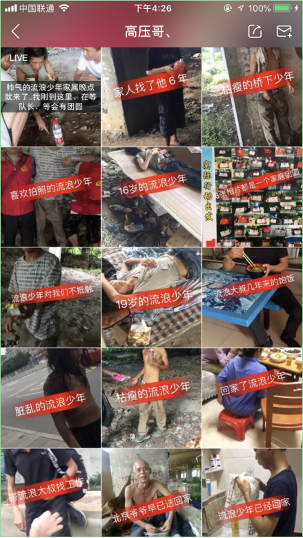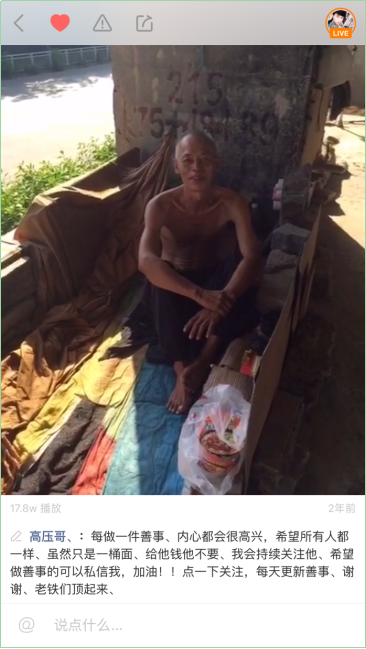 其实,天桥老爷子只是何朝成救助的流浪者中的一位。他救助的人中,有满身伤痕的大叔、枯瘦的阿姨、睡臭水沟边上的男孩……通过快手,更多人知道了流浪者的现状,并要求高压哥拍得再清晰一些,以更好辨认是否是相识之人。