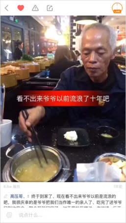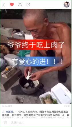 此后,何朝成陆续拍了很多天桥老人的快手短视频,越来越多的人关注到老人。老人家与何朝成的关系也从一开始的警惕、不好意思,慢慢成为朋友。有时老人还会和劝何朝成喝酒的老铁打趣:“别劝他(朝成)喝酒了,伤身体。”俨然一副“老父亲”模样。用何朝成的话来说,“已经把我当成了亲人”。