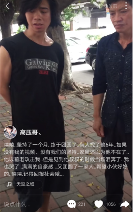 两年来,何朝成已帮忙救助了20多位流浪者,其中有6位是在快手的帮助下实现的。“我用快手拍下流浪者的样貌,通过快手引发全网老铁的关注。”在全国各地老铁的帮助下,流浪者们或者顺利回了家,或经过劝说愿意去政府救助站接受帮助。