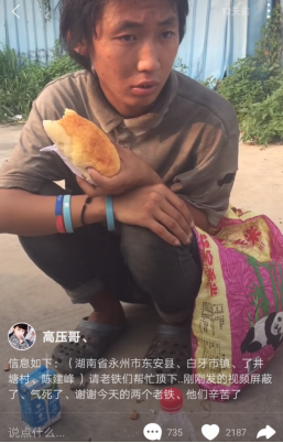 “高压哥”何朝成(快手ID:291953003)遇到的第一个流浪者