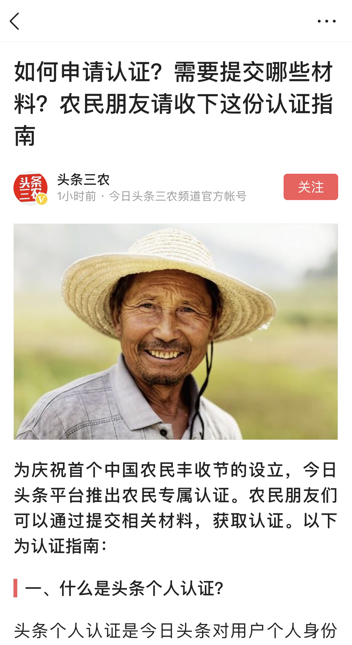 今日头条是国内首个推出农民专属认证的移动互联网内容平台。今日头条三农负责人李翼北表示,此次推出农民专属认证,既是对首个中国农民丰收节的呼应,也是基于实际业务开展中发现的真实用户需求。许多农民朋友有认证需求,但一直没有一个较好的方式来集中满足,他们也不知道如何申请。尤其在近年“逆城镇化”现象出现后,很多人才精英回到农村,参与美丽新农村建设。农民朋友对身份认证的需求越发凸显。